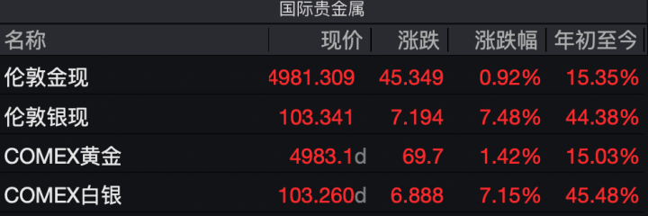 1月23日,白银现货、期货价格双双站上100美元,创历史新高。截至收盘,Wind数据显示,伦敦银现报103.341美元/盎司,日内大涨7.48%,年初至今涨幅达44.38%;COMEX白银报103.26美元/盎司,日内涨7.15%,年内涨幅达到45.48%。